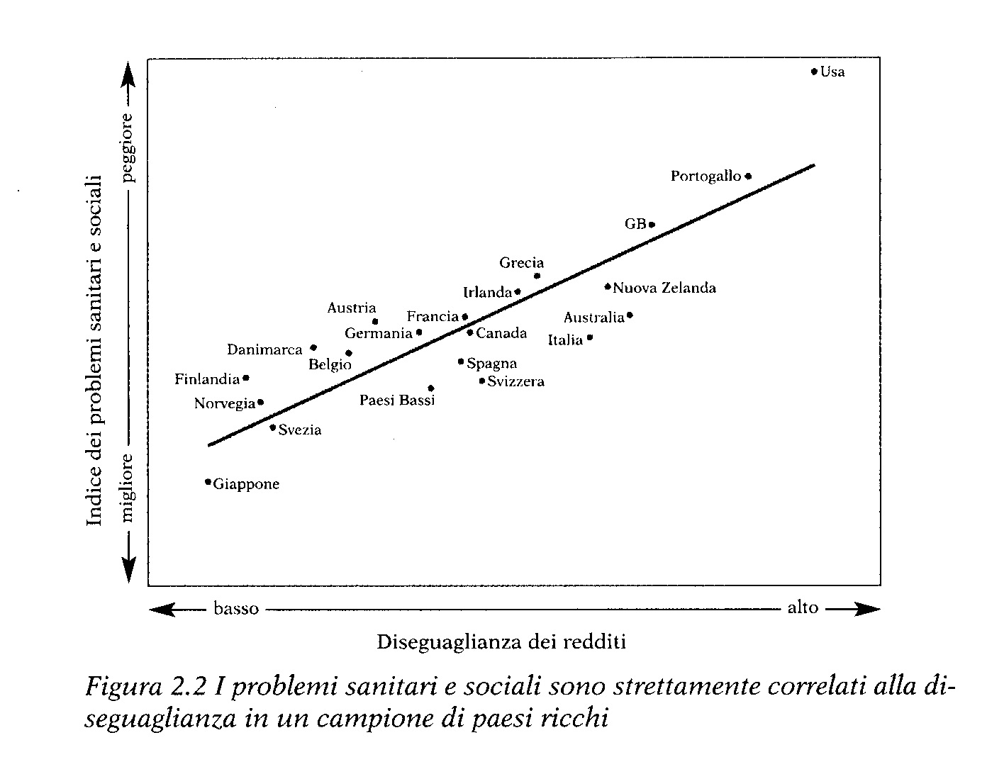 Si tratta di una relazione molto forte: nei paesi caratterizzati da una maggiore sperequazione dei redditi, la percentuale della popolazione che convive con malattie mentali è molto alta. Una relazione così netta non può essere dovuta unicamente al caso: infatti, i paesi sono quasi perfettamente allineati lungo la retta di regressione, con l'unica eccezione dell'Italia che ha un'incidenza di disturbi mentali più bassa di quanto ci si aspetterebbe sulla base del grado di diseguaglianza dei redditi. […] Le percentuali di individui affetti da turbe psichiche differiscono notevolmente da un paese dall'altro (dall'8 al 26 per cento). In Germania, Italia, Giappone e Spagna meno di una persona su dieci soffriva di disturbi mentali nei dodici mesi precedenti l'indagine; in Australia, Canada, Nuova Zelanda e Regno Unito l'incidenza dei disturbi mentali è superiore a uno su cinque, e negli Stati Uniti, come abbiamo già detto, a uno su quattro. Nel complesso, pare che i diversi livelli di diseguaglianza diano luogo a differenze più che triple nella percentuale di individui affetti da turbe psichiche nei diversi paesi. Nel caso dei nove paesi in cui sono state condotte le indagini dell'Oms, possiamo esaminare anche i diversi tipi di malattia mentale, e più precisamente gli stati ansiosi, i disturbi dell'umore, le turbe legate al controllo dell'impulsività e le dipendenze, nonché i casi di malattie mentali molto gravi. Gli stati ansiosi, i disturbi legati al controllo dell'impulsività e le turbe psichiche gravi sono tutti fortemente correlati alla diseguaglianza, mentre i disordini dell'umore lo sono in misura minore. Come descritto nel capitolo 3, negli ultimi decenni i paesi sviluppati hanno visto aumentare progressivamente l'incidenza dell'ansia. Gli stati ansiosi rappresentano la più grande categoria di disturbi mentali in tutti i paesi del nostro campione; a ben guardare, la percentuale degli stati ansiosi sul totale dei disturbi psichici è significativamente più alta nei paesi affetti da maggiori disparità economiche. Sfortunatamente, non vi sono fonti internazionali di dati comparabili sulla salute mentale dei bambini e degli adolescenti... Aggrappati alla scala Perché, dunque, nei paesi affetti da maggiori disparità economiche l'incidenza dei disturbi mentali è più alta? Lo psicologo e giornalista Oliver James ha spiegato la relazione tra i due fenomeni con la metafora delle malattie infettive. Secondo James, il virus dell'"affluenza" ‑ un "insieme di valori che accrescono la nostra vulnerabilità ai disturbi emotivi" [54, p. 7] ‑ è molto più diffuso nelle società benestanti, dove si attribuisce una grande importanza all'accumulazione di denaro e beni materiali, al trasmettere una buona immagine di sé agli altri e al diventare famosi. Questi valori, strettamente correlati a quelli che abbiamo discusso nel capitolo 3, ci espongono a un più alto rischio di depressione, ansia, consumo di sostanze tossiche e disturbi della personalità. In un altro libro recente sullo stesso argomento, il filosofo Alain de Botton definisce l’«ansia da status" un "timore talora così assillante da compromettere intere fasi esistenziali". Se non riusciamo a mantenere la nostra posizione nella scala sociale, siamo condannati "da un lato, a considerare con acredine quanti hanno successo, dall'altro, a vergognarci di noi stessi" [55, pp. 5‑6]. Il medesimo fenomeno è stato esaminato dall'economista Robert Frank, che ha parlato di "febbre del lusso" [56]. Al crescere delle disparità dei redditi, i super‑ricchi spendono sempre di più nell'acquisto di beni voluttuari; il desiderio di possedere questi oggetti si trasmette a cascata lungo la scala del reddito, con il risultato che tutti gli altri sono costretti a competere per restare al passo. I pubblicitari fanno leva su queste dinamiche, rendendoci insoddisfatti di ciò che abbiamo e favorendo paragoni basati sull'invidia sociale. Un altro economista, Richard Layard, ha parlato di una vera e propria "dipendenza dal reddito": quanto più possediamo, tanto più pensiamo di aver bisogno di possedere e tanto più tempo dedichiamo al perseguimento della ricchezza e dei possedimenti materiali, a spese della vita familiare, delle relazioni e della qualità della vita. Data l'importanza delle relazioni sociali per la salute mentale, non stupiamoci se le società con bassi livelli di fiducia e una vita di comunità debole sono anche quelle con una maggiore incidenza di disturbi psichici.” (pp. 75-81) 5. Tra le numerose tabelle che corredano il saggio, la 2.2 e la 5.1, che ho entrambe riportato, sono le più significative, anche perché in tutte le altre, riferite alla salute fisica, all’obesità, al rendimento scolastico, alla violenza, ecc., la nuvola di punti sembra seguire un andamento analogo. Ciò giustifica la conclusione con cui si avvia la terza parte del libro, che è identica a quella esposta nel primo capitolo, ma confortata da dati poco o punto oppugnabili: “Nei paesi ricchi del mondo sviluppato e nei cinquanta stati degli Usa i principali problemi sanitari e sociali delle nazioni benestanti tendono a essere più diffusi nelle società affette da maggiori diseguaglianze. In entrambi i contesti le relazioni sono talmente forti da non poter essere attribuite semplicemente al caso; la loro rilevanza non può essere sottovalutata. In primo luogo, tra i paesi e gli stati degli Usa esaminati esistono differenze molto ampie: nelle realtà caratterizzate da maggiori disparità economiche, l'incidenza dei problemi sanitari e sociali è da tre a dieci volte più alta. In secondo luogo, non si tratta di differenze tra i gruppi ad alto e basso rischio all'interno della popolazione, le quali riguardano perciò soltanto una minoranza della popolazione stessa, oppure soltanto i poveri; si tratta invece di differenze nell'incidenza di problemi sociali che riguardano l'intera popolazione.” (p. 177) Su questa base, sembra lecito qualifica